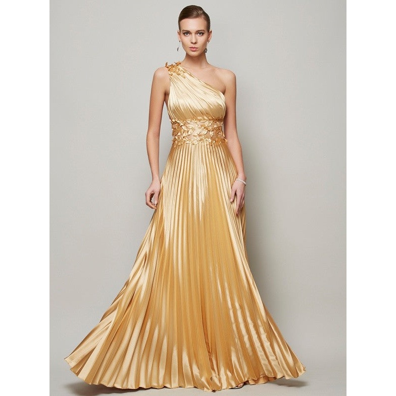 A-Line/Princess One-Shoulder Sleeveless Hand-Made Flower Long Woven Satin Dresses