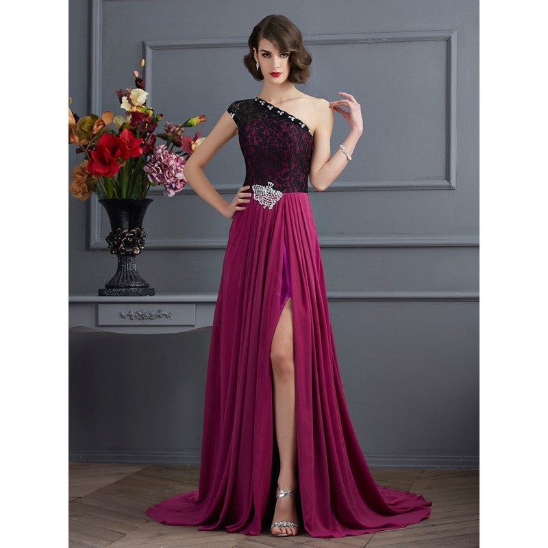 A-Line/Princess One-Shoulder Sleeveless Lace Long Chiffon Dresses