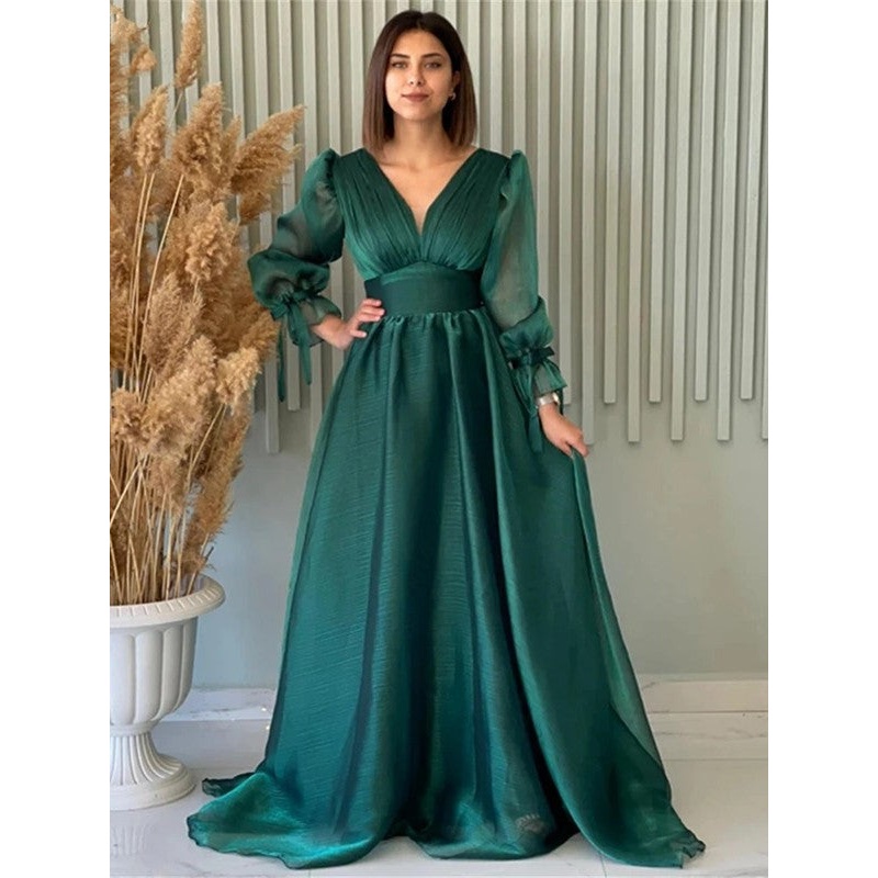 A-Line/Princess Organza Ruched V-neck Long Sleeves Sweep/Brush Train Dresses