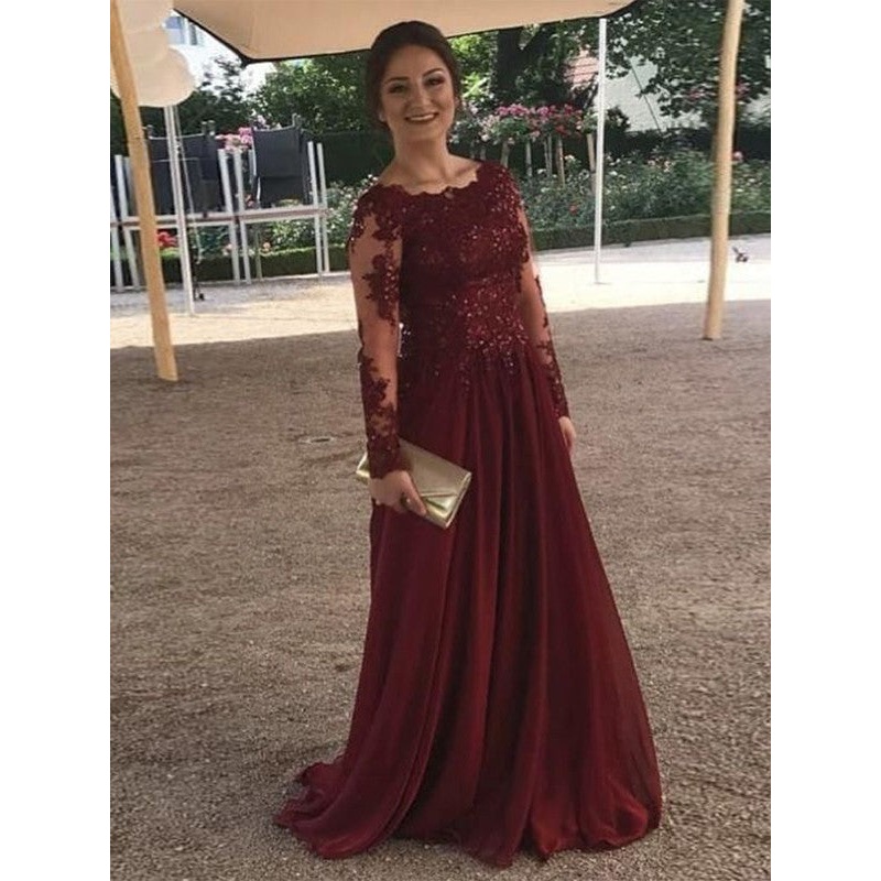 A-Line/Princess Satin Applique Scoop Long Sleeves Sweep/Brush Train Mother of the Bride Dresses