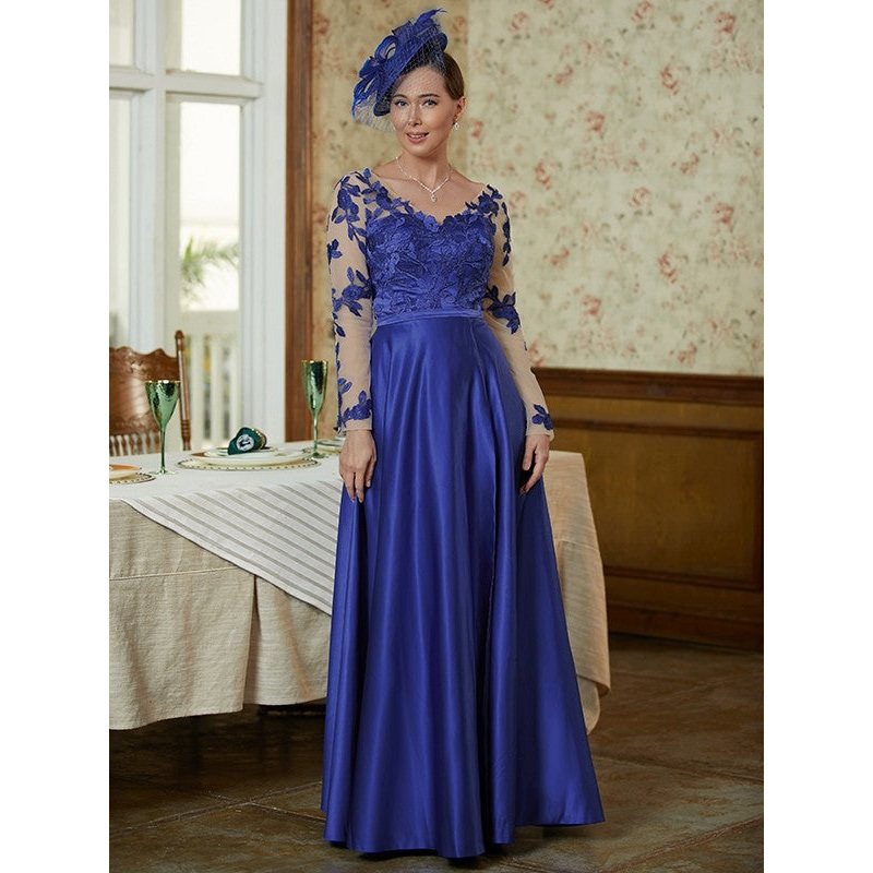 A-Line/Princess Satin Applique V-neck Long Sleeves Floor-Length Mother of the Bride Dresses