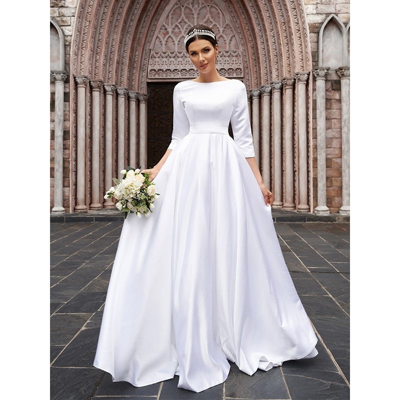 A-Line/Princess Satin Bowknot Bateau 3/4 Sleeves Sweep/Brush Train Wedding Dresses
