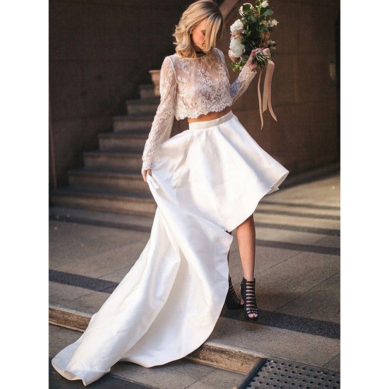 A-Line/Princess Satin Lace Scoop Long Sleeves Sweep/Brush Train Two Piece Wedding Dresses