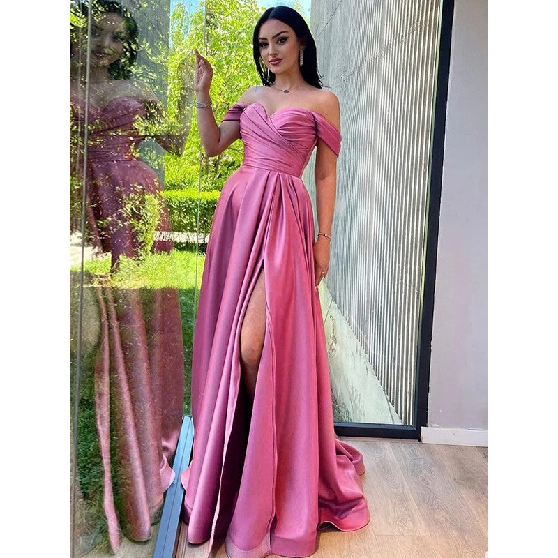 A-Line/Princess Satin Ruched Off-the-Shoulder Sleeveless Sweep/Brush Train Dresses