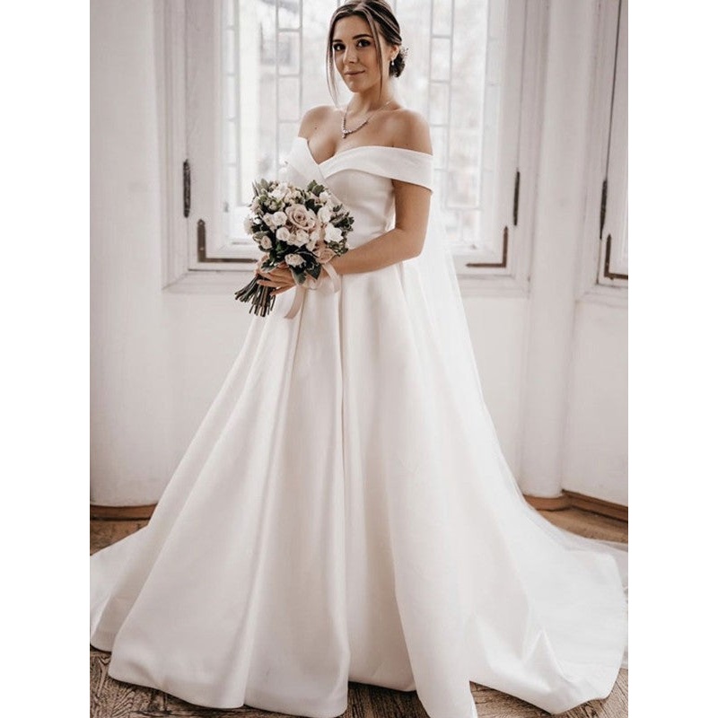 A-Line/Princess Satin Ruffles Off-the-Shoulder Sleeveless Sweep/Brush Train Wedding Dresses