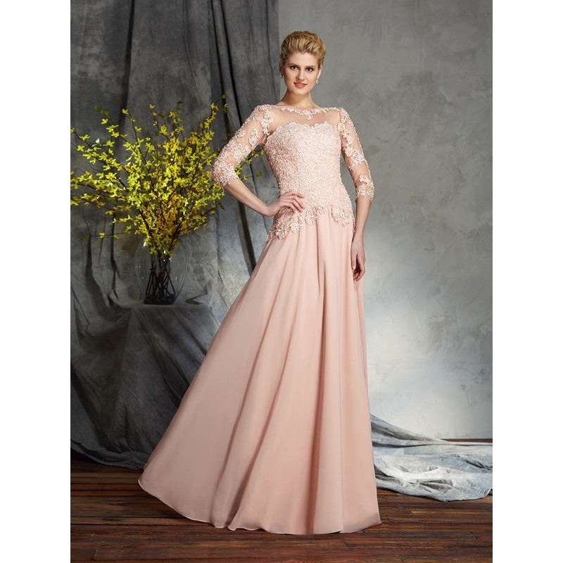 A-Line/Princess Scoop Applique 3/4 Sleeves Long Chiffon Mother of the Bride Dresses