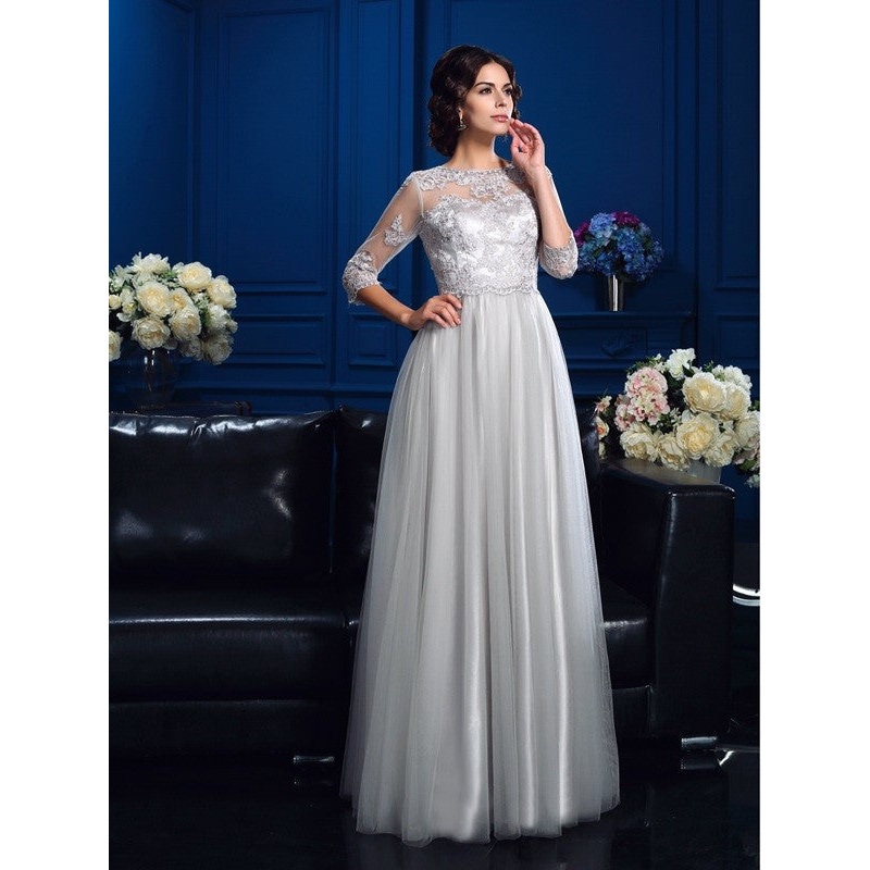 A-Line/Princess Scoop Applique 3/4 Sleeves Long Woven Satin Mother of the Bride Dresses