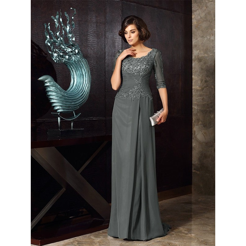 A-Line/Princess Scoop Beading 1/2 Sleeves Long Chiffon Mother of the Bride Dresses
