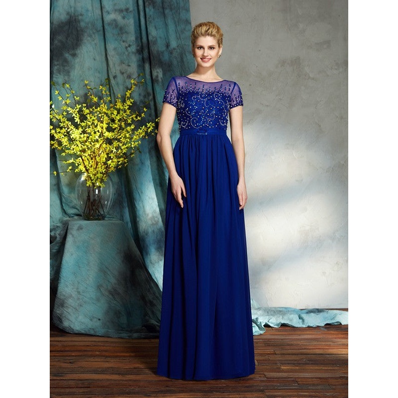 A-Line/Princess Scoop Beading Short Sleeves Long Chiffon Mother of the Bride Dresses