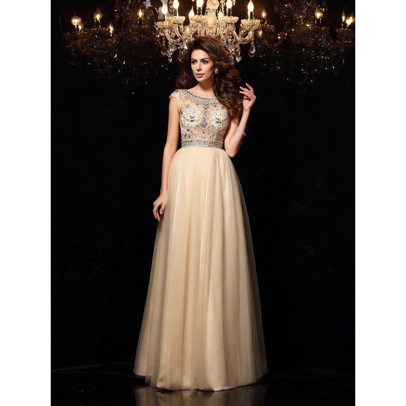 A-Line/Princess Scoop Beading Sleeveless Long Net Dresses