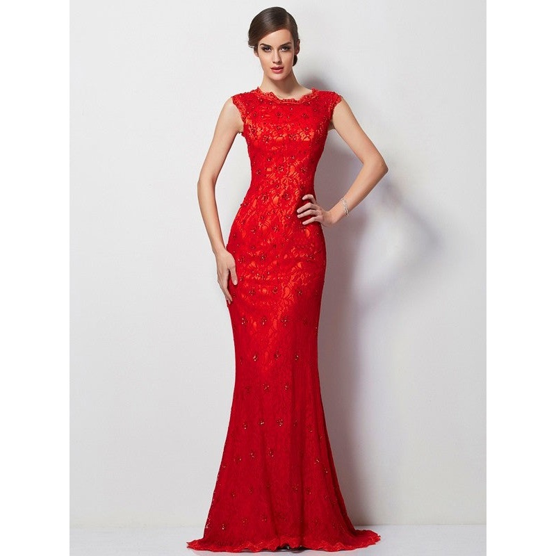 A-Line/Princess Scoop Short Sleeves Applique Long Lace Dresses