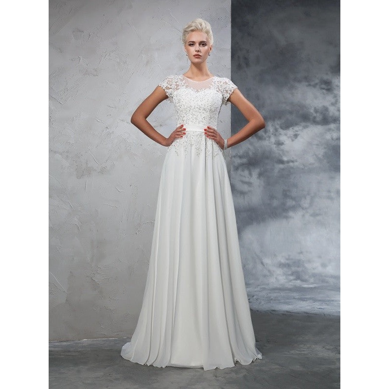 A-Line/Princess Sheer Neck Applique Short Sleeves Long Chiffon Wedding Dresses