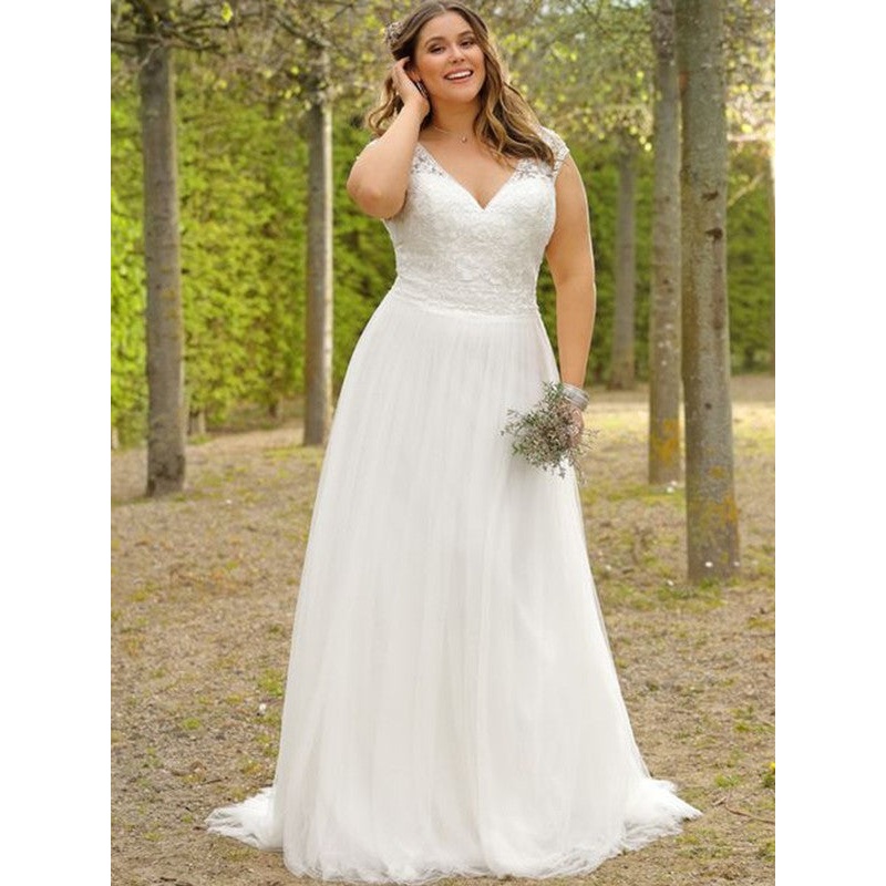 A-Line/Princess Short Sleeves Tulle Applique V-neck Sweep/Brush Train Plus Size Wedding Dresses