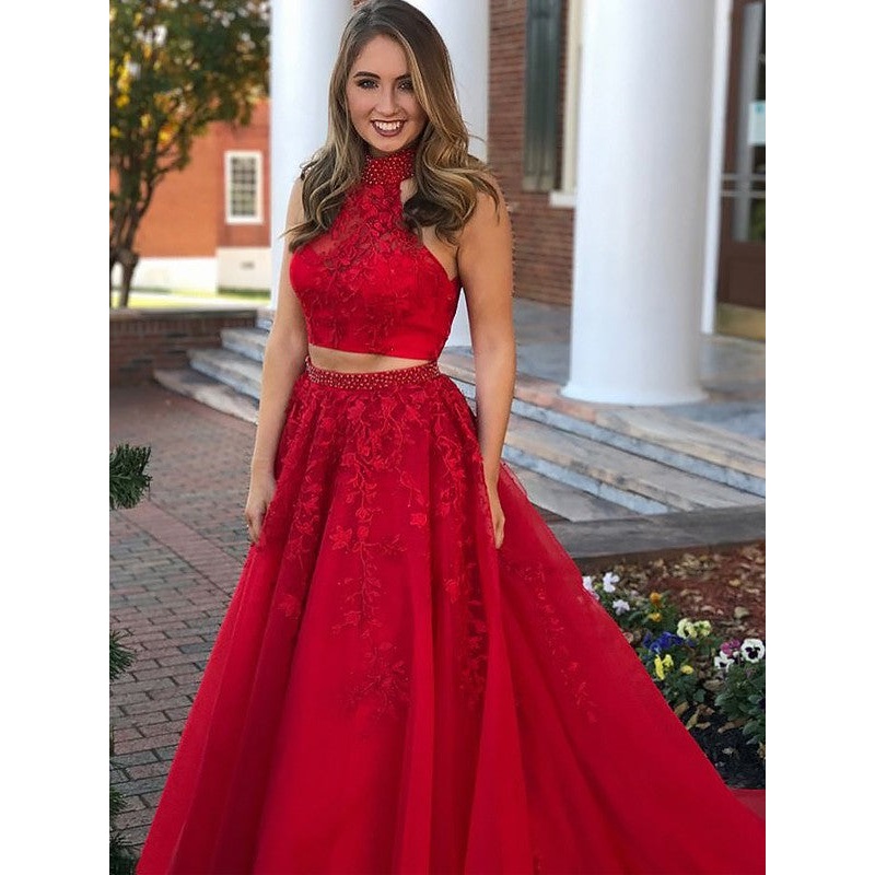 A-Line/Princess Sleeveless Halter Beading Tulle Floor-Length Two Piece Dresses