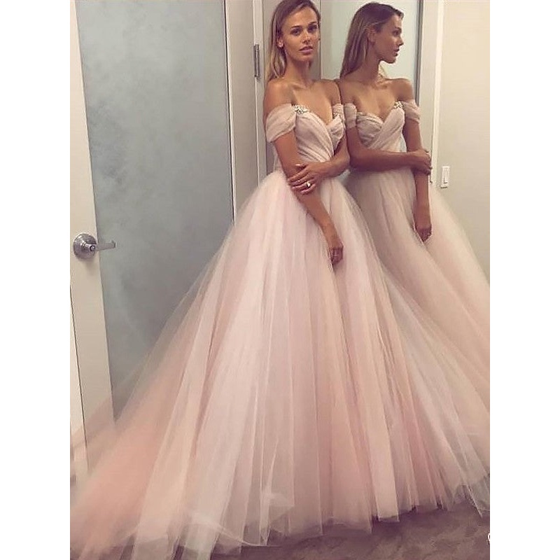 A-Line/Princess Sleeveless Off-the-Shoulder Tulle Beading Sweep/Brush Train Dresses