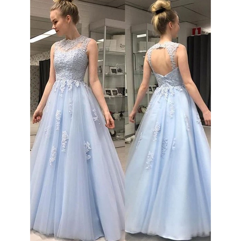 A-Line/Princess Sleeveless Sheer Neck Floor-Length Applique Tulle Dresses
