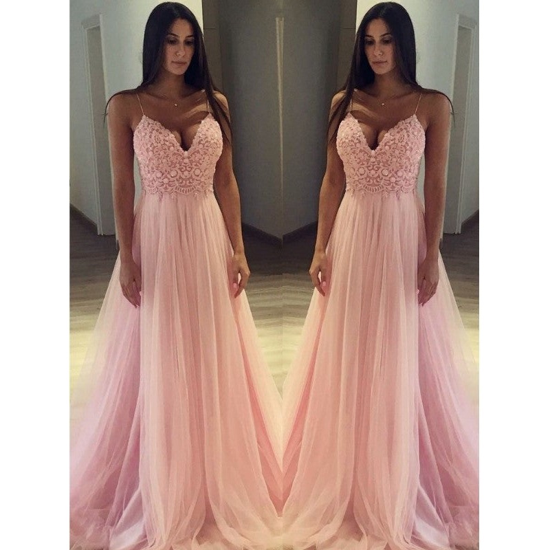 A-Line/Princess Sleeveless Spaghetti Straps Sweep/Brush Train Applique Tulle Dresses