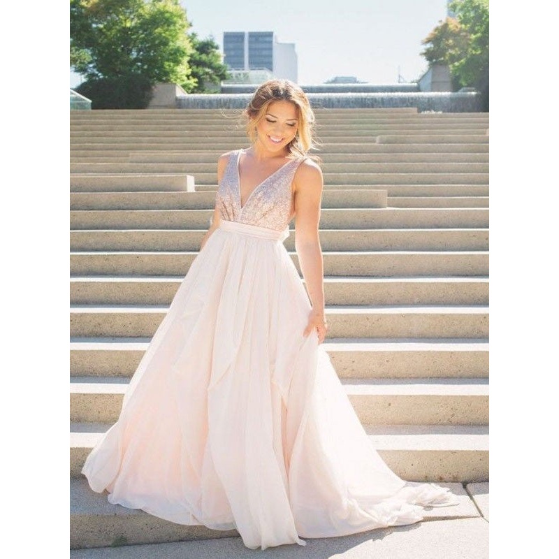 A-Line/Princess Sleeveless V-neck Sweep/Brush Train Sequin Organza Dresses