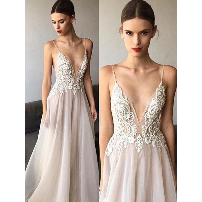 Be the first to review “A-Line/Princess Sleeveless V-neck Sweep/Brush Train Spaghetti Straps Lace Organza Wedding Dresses”