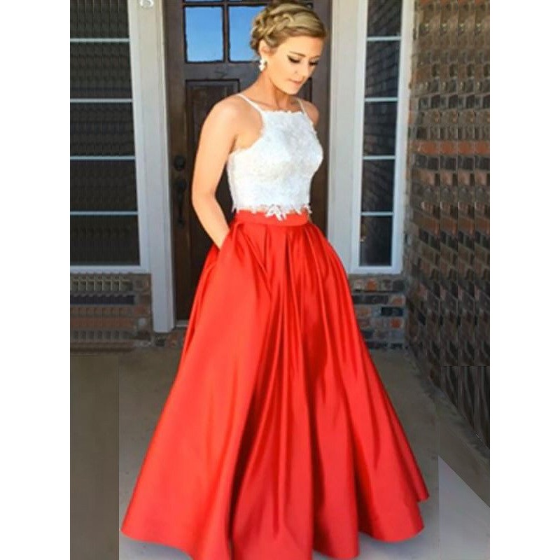 A-Line/Princess Spaghetti Straps Sleeveless Satin Floor-Length Lace Two Piece Dresses