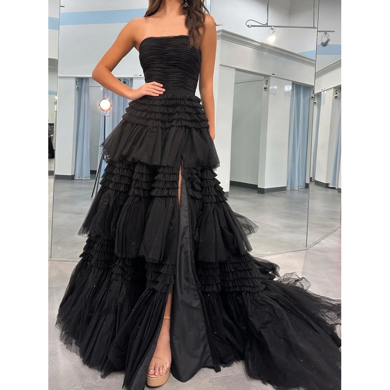 A-line/Princess strapless slit with glossy long prom dress