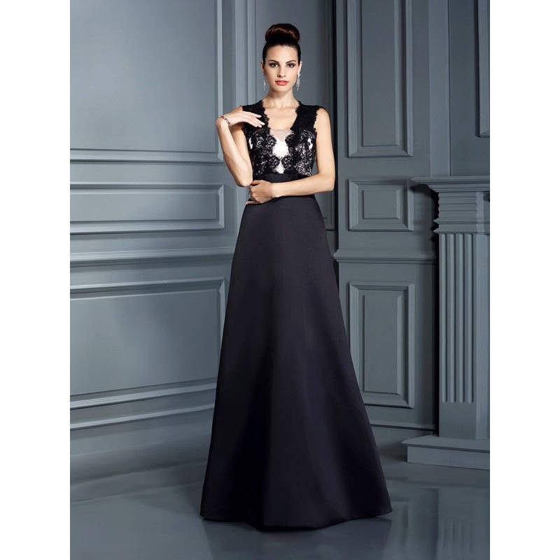 A-Line/Princess Straps Lace Sleeveless Long Satin Dresses