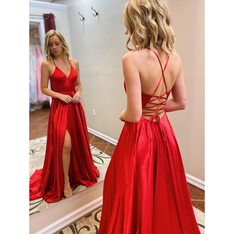 A-Line/Princess Sweep/Brush Train V-neck Sleeveless Woven Satin Ruffles Dresses