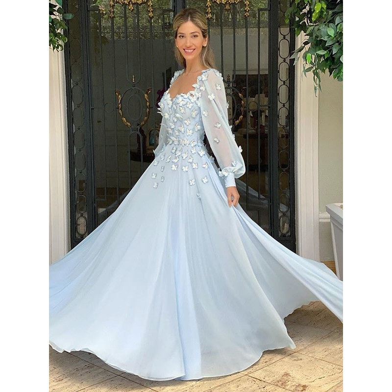 A-Line/Princess Sweetheart Chiffon Long Sleeves Applique Floor-Length Dresses