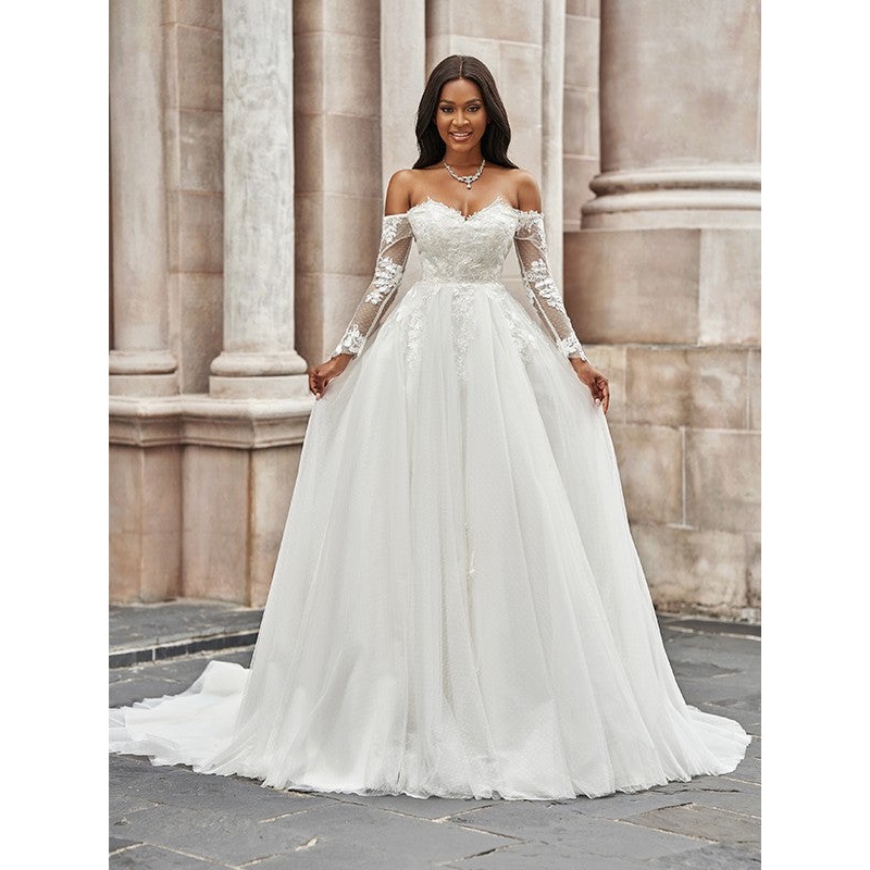 A-Line/Princess Tulle Applique Off-the-Shoulder Long Sleeves Sweep/Brush Train Wedding Dresses