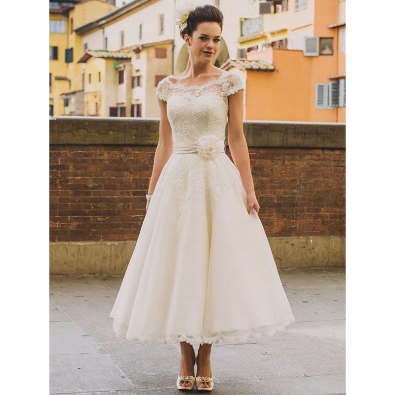 A-Line/Princess Tulle Lace Scoop Short Sleeves Tea-Length Wedding Dresses