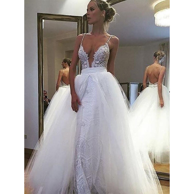 A-Line/Princess Tulle Lace Spaghetti Straps Sleeveless Floor-Length Wedding Dresses