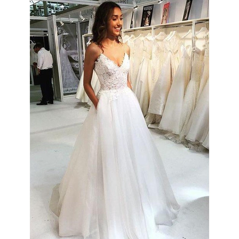 A-Line/Princess Tulle Lace V-neck Sleeveless Floor-Length Wedding Dresses