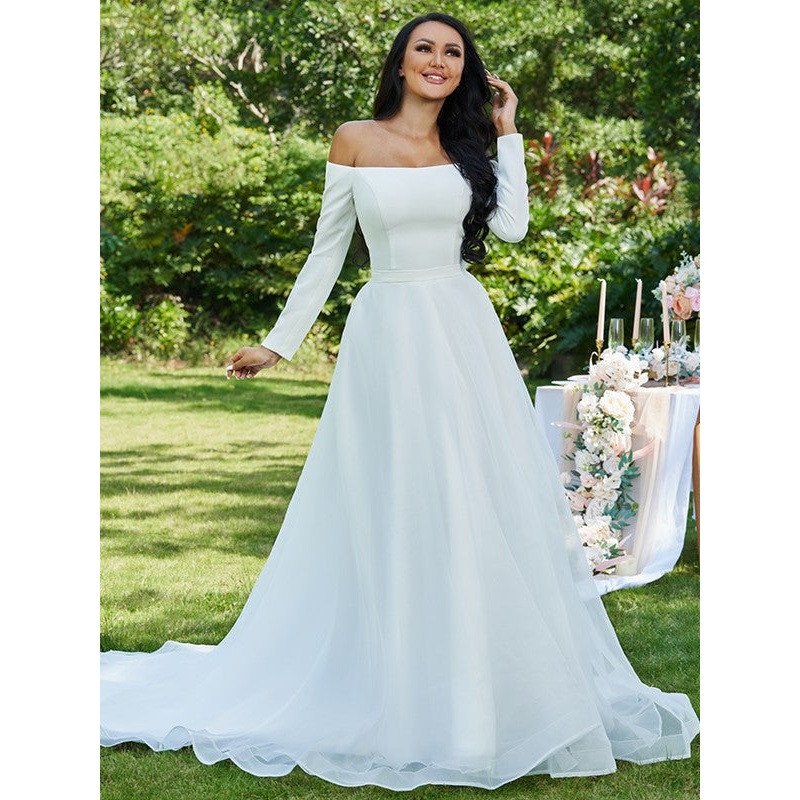 A-Line/Princess Tulle Ruffles Off-the-Shoulder Long Sleeves Sweep/Brush Train Wedding Dresses