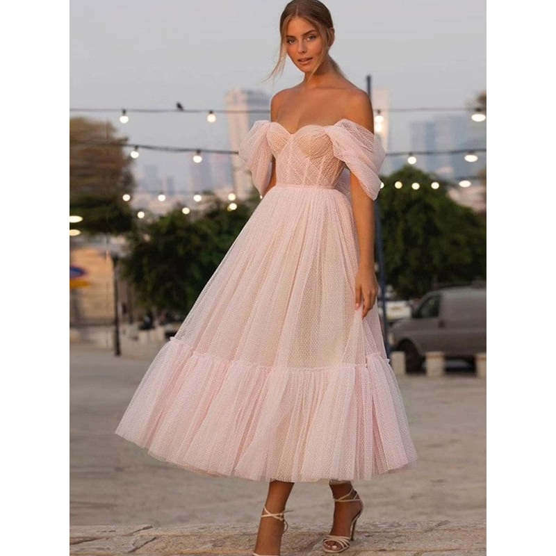 A-Line/Princess Tulle Ruffles Off-the-Shoulder Sleeveless Tea-Length Dresses