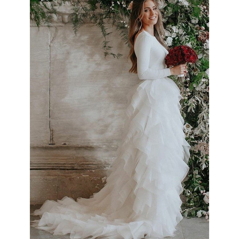 A-Line/Princess Tulle Ruffles Scoop Long Sleeves Sweep/Brush Train Wedding Dresses