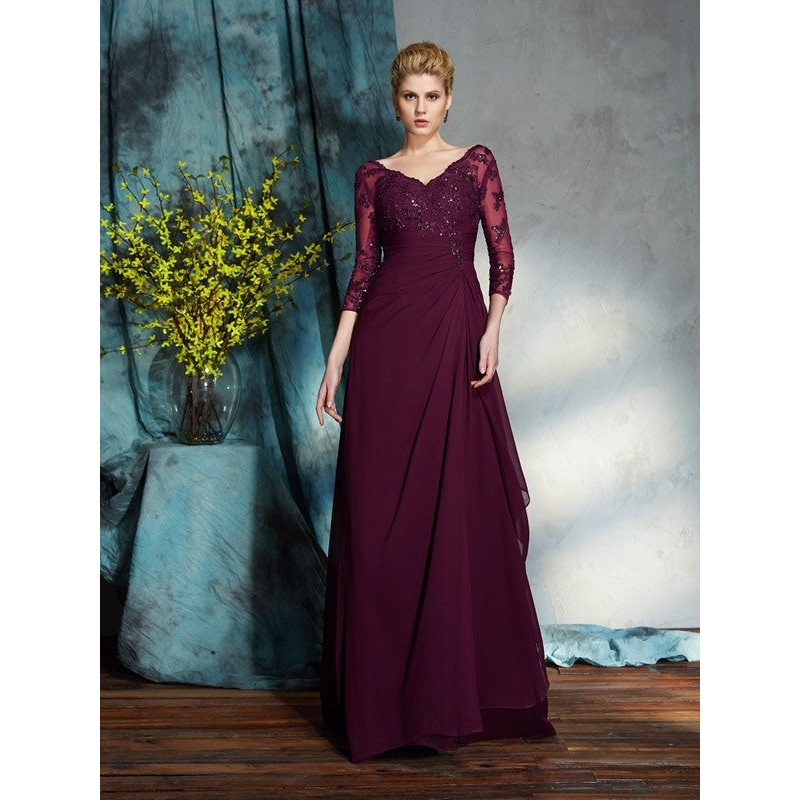 A-Line/Princess V-neck Beading 3/4 Sleeves Long Chiffon Mother of the Bride Dresses