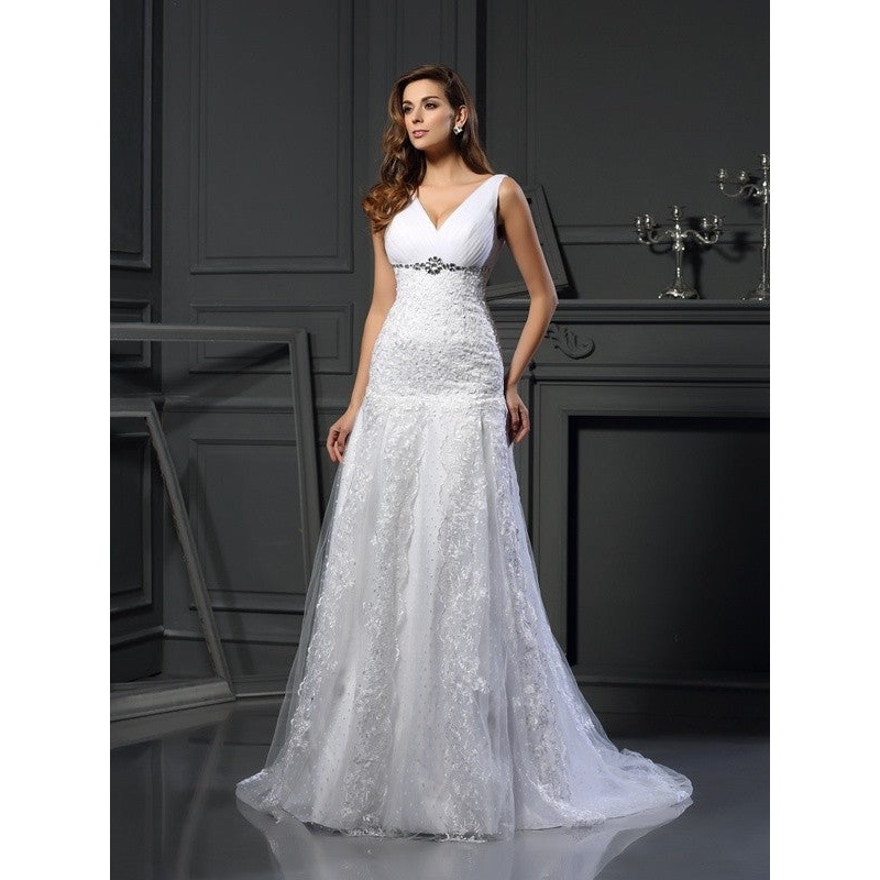 A-Line/Princess V-neck Beading Sleeveless Long Satin Wedding Dresses