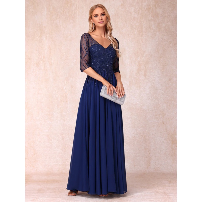 A-line/Princess V-neck Half Sleeve Long Formal Bead Decoration Mother of the bride Dress