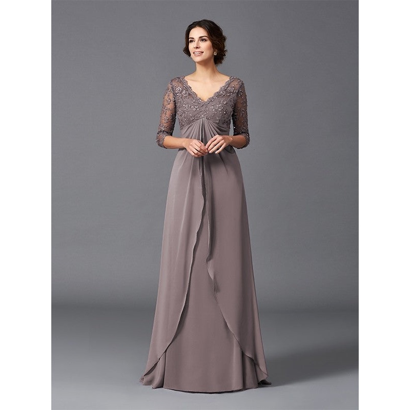 A-Line/Princess V-neck Lace 3/4 Sleeves Long Chiffon Mother of the Bride Dresses