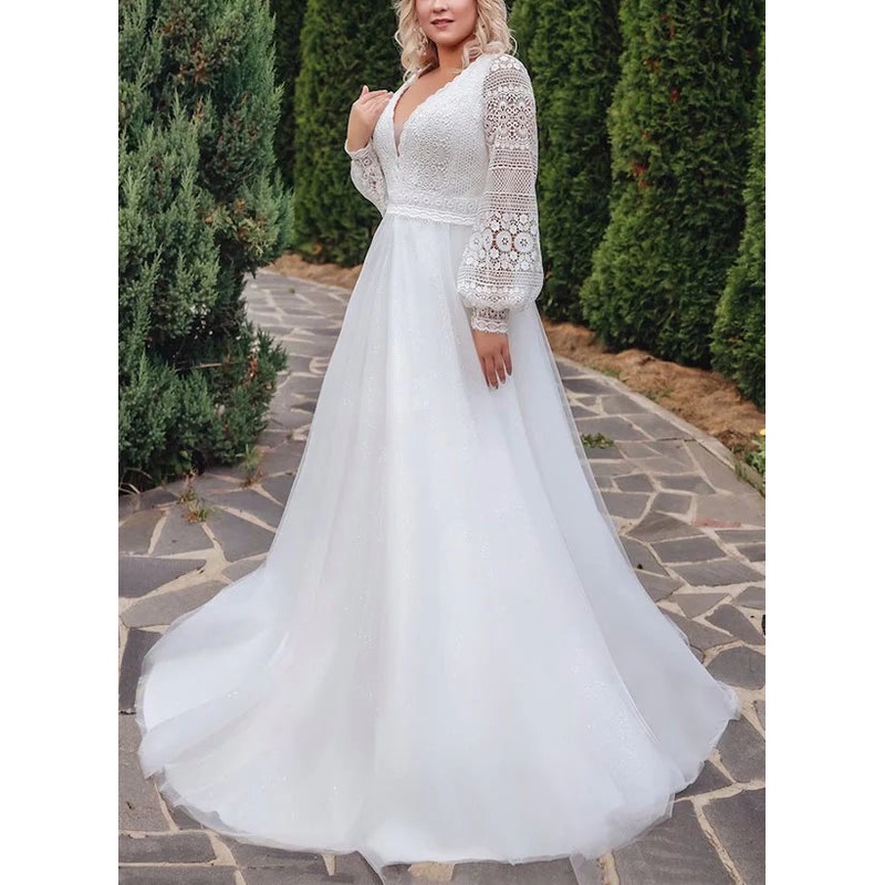 A-line/Princess V-neck Large Sticker Lace Wedding Dress