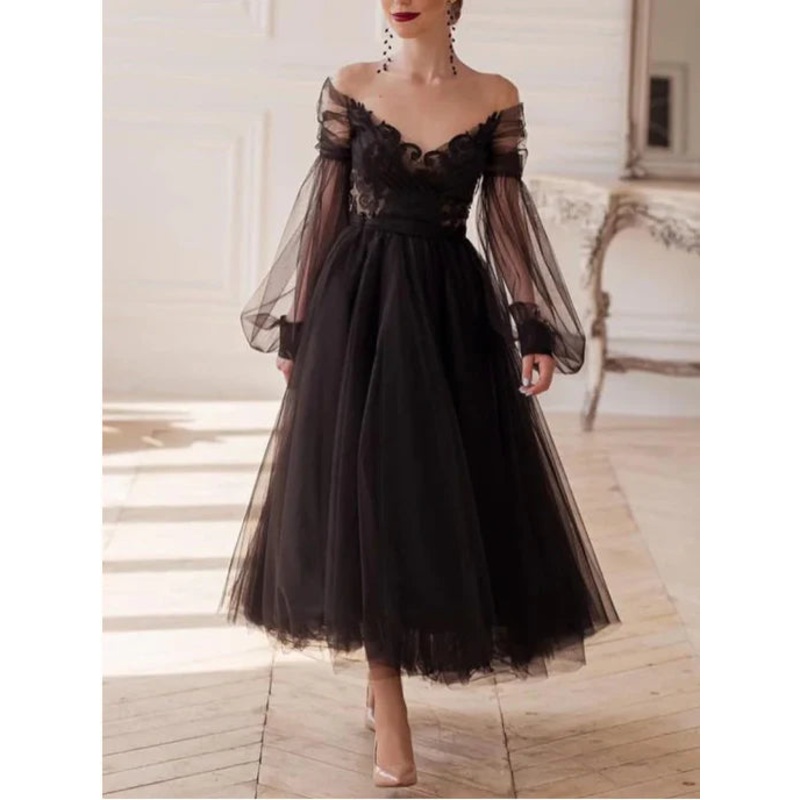 A-line/Princess V-neck Long sleeved Ankle Evening Dress