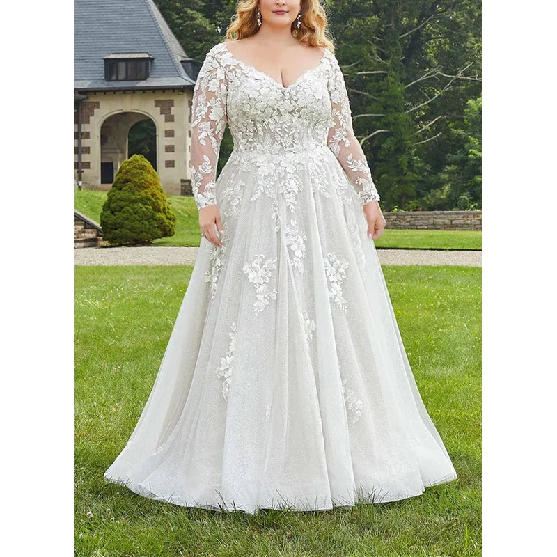 A-line/Princess V-neck Long sleeved Large Size Applique Lace Wedding Dress
