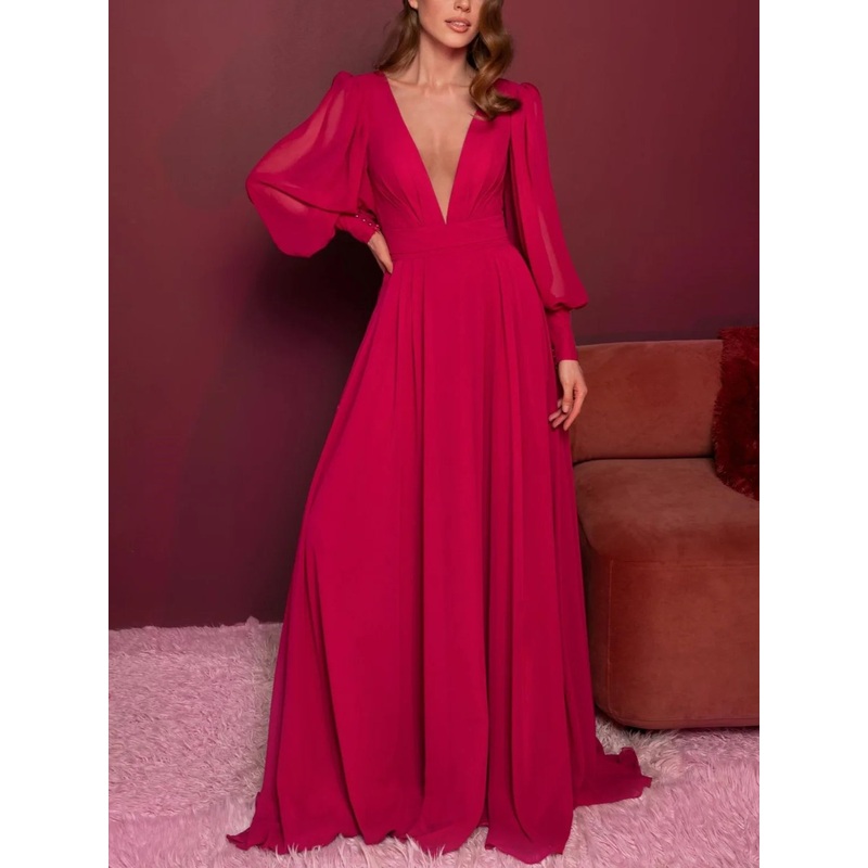 A-line/Princess V-neck Long sleeved Ruffle Edge Floor Mop Evening Dress