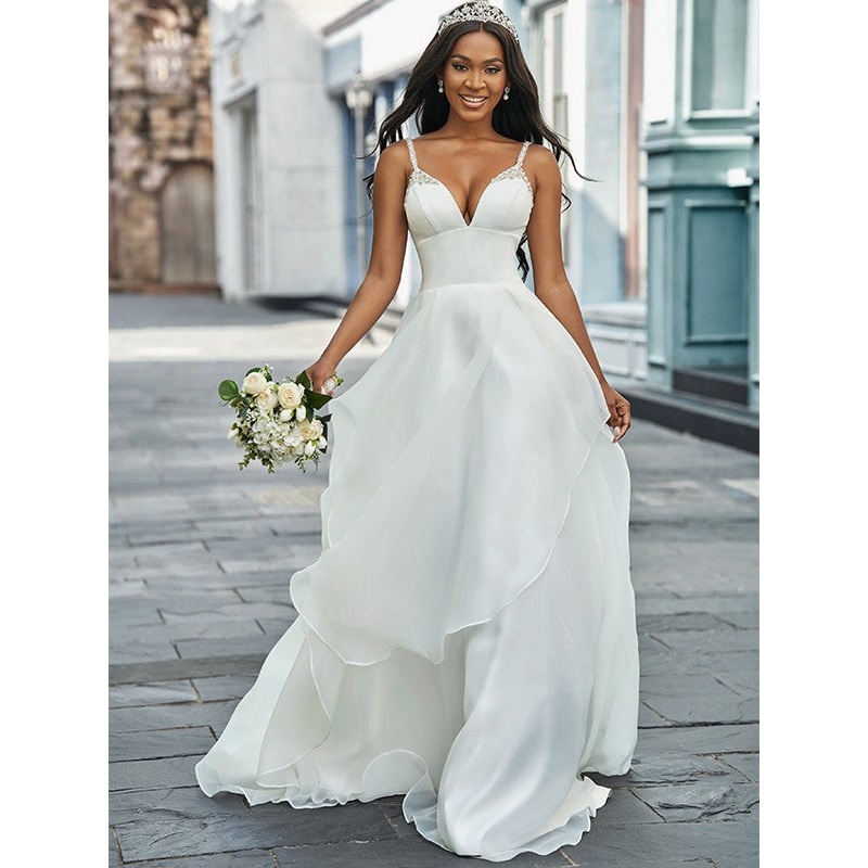 A-Line/Princess V-neck Organza Sleeveless Beading Sweep/Brush Train Wedding Dresses