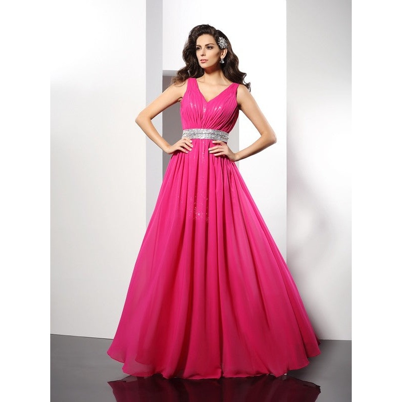 A-Line/Princess V-neck Paillette Sleeveless Long Chiffon Dresses