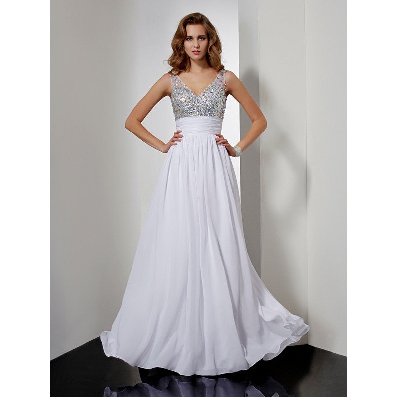 A-Line/Princess V-neck Rhinestone Sleeveless Long Chiffon Dresses