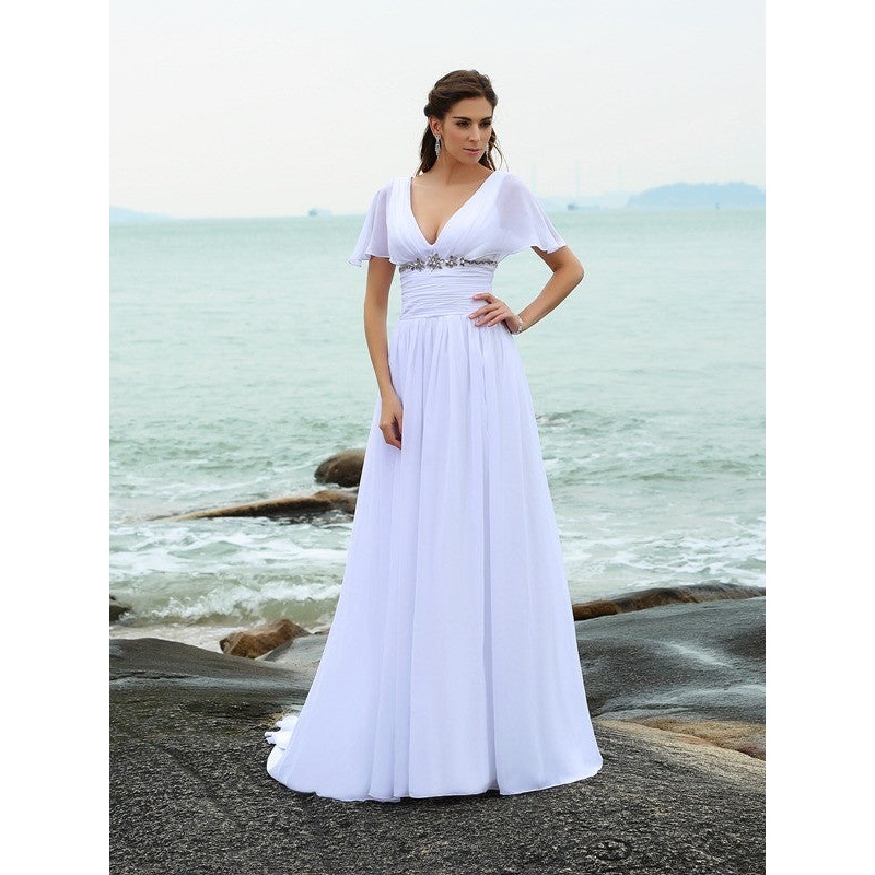 A-Line/Princess V-neck Ruffles Short Sleeves Long Chiffon Beach Wedding Dresses