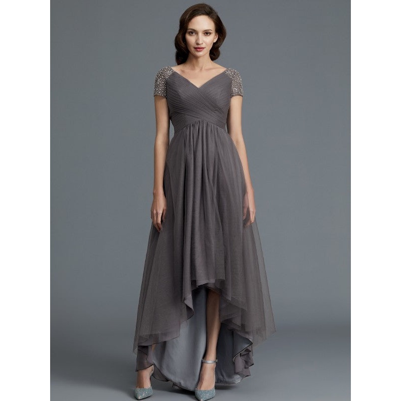 A-Line/Princess V-neck Short Sleeves Asymmetrical Tulle Mother of the Bride Dresses