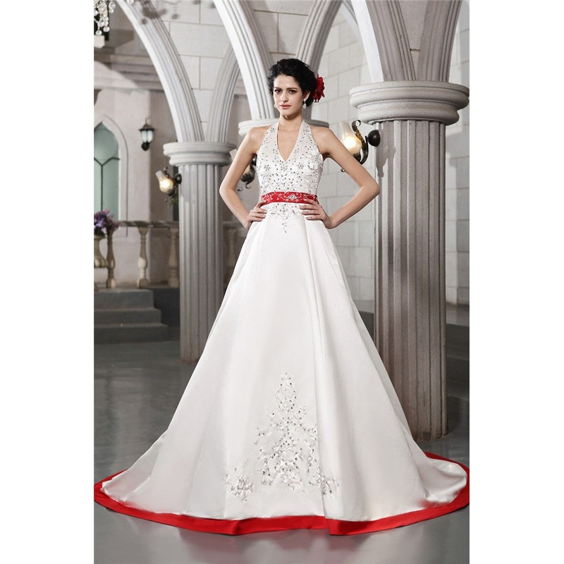A-Line/Princess V-neck Sleeveless Beading Embroidery Long Satin Wedding Dresses
