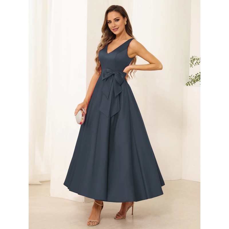 A-line princess V-neck sleeveless bow long mother of the bride dress
